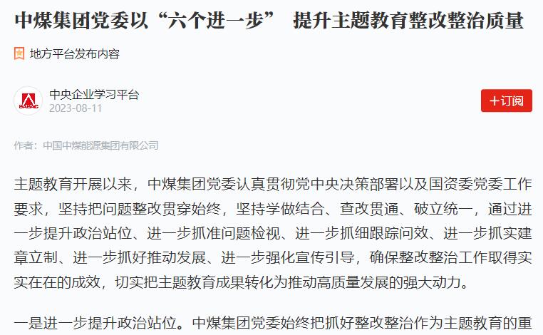 主題教育開展以來,中煤集團黨委認真貫徹黨中央決策部署以及國資委黨委工作要求,堅持把問題整改貫穿始終,堅持學做結合、查改貫通、破立統一,通過進一步提升政治站位、進一步抓準問題檢視、進一步抓細跟蹤問效、進一步抓實建章立制、進一步抓好推動發展、進一步強化宣傳引導,確保整改整治工作取得實實在在的成效,切實把主題教育成果轉化為推動高質量發展的強大動力。