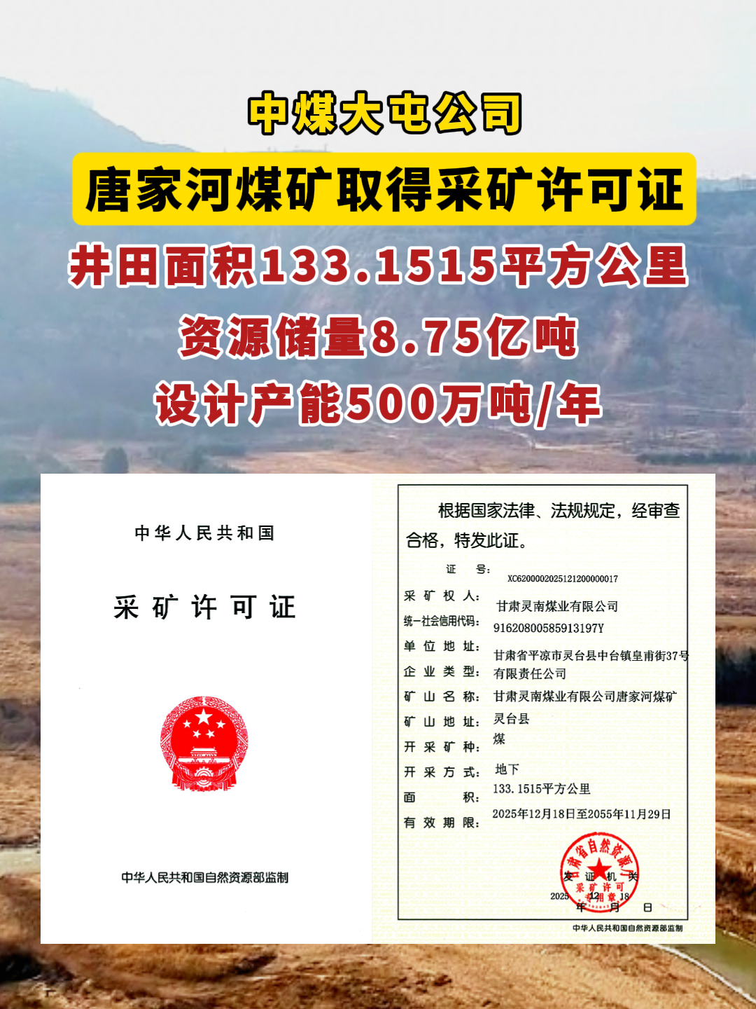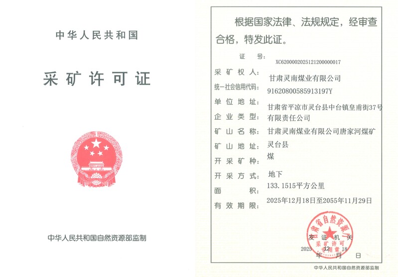 12月18日,甘肅靈南煤業(yè)有限公司唐家河煤礦獲得甘肅省自然資源廳核發(fā)的采礦許可證,這是繼11月份該礦取得不動(dòng)產(chǎn)證書后的又一關(guān)鍵進(jìn)展,為剩余前期手續(xù)辦理奠定了堅(jiān)實(shí)的基礎(chǔ)。